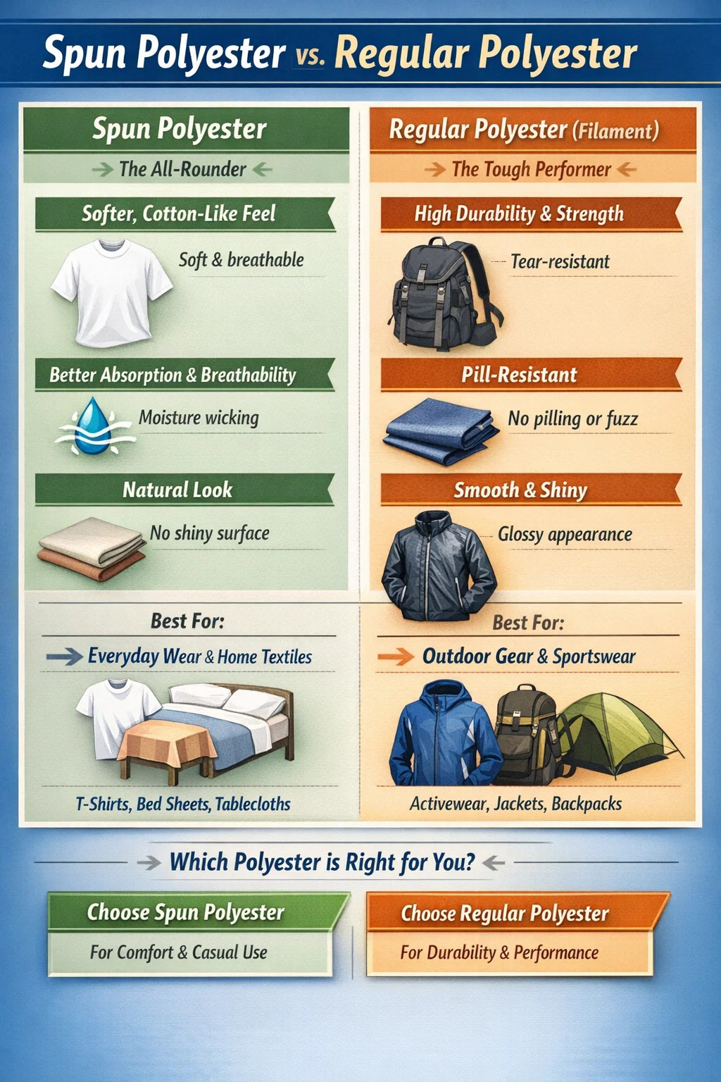 لا يحتوي البوليستر المغزول والبوليستر العادي (عادةً ما يشير إلى خيوط البوليستر) على خيار "أفضل" أو "أسوأ" مطلقًا؛ يعتمد ذلك على نوع تجربة الارتداء أو الاستخدام التي تعطيها الأولوية.
