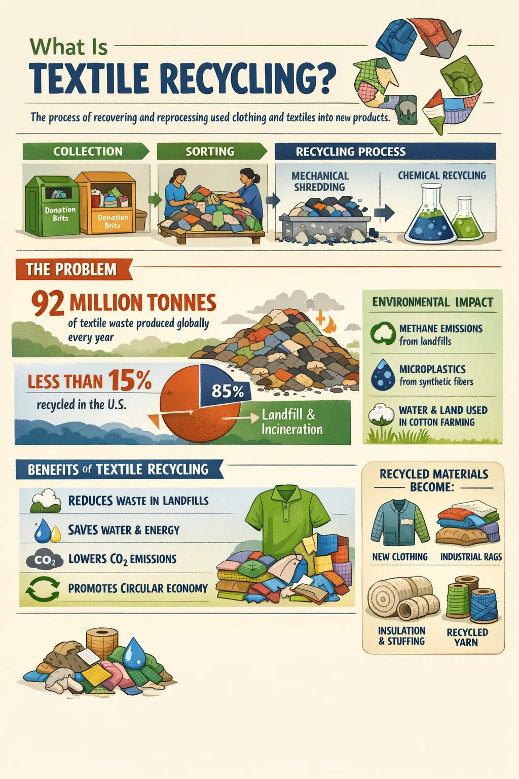 Content إعادة تدوير المنسوجات هي عملية استعادة الملابس والأقمشة والمواد القائمة على الألياف المستعملة أو المهملة وإعادة معالجتها إلى منتجات جديدة - بدلاً من إرسالها إلى مكب النفايات أو حرقها. يمكن تحويل المواد المستردة إلى ملابس جديدة أو خرق صناعية أو مواد عازلة أو حشو أو خيوط أو ألياف خام. باختصار، إنه نظام يحافظ على تداول المنسوجات وبعيدًا عن مجاري النفايات. والحاجة لهذا النظام ملحة. تنتج صناعة الأزياء العالمية ما يقدر بنحو 92 مليون طن من نفايات المنسوجات كل عام. وفي الولايات المتحدة وحدها، تشير تقارير وكالة حماية البيئة إلى أن الأميركيين يتخلصون من أكثر من 17 مليون طن من نفايات المنسوجات سنويا، ومع ذلك يتم جمع أقل من 15% منها لإعادة الاستخدام أو إعادة التدوير. وينتهي الأمر بالباقي مدفونًا في الأرض أو محترقًا. تنطبق إعادة تدوير المنسوجات على مجموعة واسعة من المواد: القطن، والبوليستر، والصوف، والنايلون، والكتان، والحرير، والأقمشة المخلوطة. يتطلب كل منها أسلوبًا مختلفًا للاسترداد اعتمادًا على نوع الألياف وحالتها ومستوى التلوث. من بين جميع فئات الألياف، إعادة تدوير القطن programs attract the most attention because cotton is both the most widely used natural fiber in the world and one of the most resource-intensive crops to grow. قبل فهم كيفية عمل إعادة تدوير المنسوجات، من المفيد أن نفهم بالضبط ما يحدث عندما يتم التخلص من المنسوجات بدلاً من استعادتها. عندما تتحلل الألياف الطبيعية مثل القطن أو الصوف في ظروف مدافن النفايات - انخفاض الأكسجين والضغط العالي - فإنها تطلق غاز الميثان، وهو أحد الغازات الدفيئة مع إمكانية ارتفاع درجة الحرارة بحوالي 28 مرة أكبر من ثاني أكسيد الكربون على مدى 100 عام. الألياف الاصطناعية مثل البوليستر والنايلون لا تتحلل بيولوجيًا على الإطلاق؛ فهي تتفتت إلى مواد بلاستيكية دقيقة تتسرب إلى المياه الجوفية وفي النهاية إلى السلسلة الغذائية. تتطلب زراعة كيلوغرام واحد من القطن البكر ما يقرب من 10000 لتر من الماء - ما يكفي لشخص واحد للشرب لمدة 14 عاما تقريبا. وتمثل زراعة القطن أيضًا حوالي 16% من إجمالي استخدامات المبيدات الحشرية في جميع أنحاء العالم، على الرغم من أنها تشغل 2.5% فقط من الأراضي الزراعية العالمية. في كل مرة يتم التخلص من الملابس القطنية بدلاً من إعادة تدويرها، يتم إهدار تلك التكاليف البيئية المدمجة بالكامل. صناعة الأزياء مسؤولة عن نحو 10% من انبعاثات الكربون العالمية السنوية، أي أكثر من الطيران الدولي والشحن البحري مجتمعين، وفقا لبرنامج الأمم المتحدة للبيئة. تأتي معظم هذه البصمة من إنتاج المواد الخام والصباغة والتشطيب. وإعادة تدوير المنسوجات، خاصة عندما تحل محل إنتاج الألياف البكر، تقلل بشكل مباشر من هذا الرقم. تختلف عملية إعادة التدوير اعتمادًا على ما إذا كانت المادة يتم تكسيرها ميكانيكيًا أو إذابتها كيميائيًا. فيما يلي عرض تفصيلي واضح للمراحل الرئيسية. تدخل المنسوجات في مسار إعادة التدوير من خلال عدة قنوات: صناديق التسليم في الشوارع أو في متاجر البيع بالتجزئة، والتبرعات الخيرية ومتاجر التوفير، وجمع الرصيف البلدي، وبرامج استعادة العلامات التجارية، والقطع الصناعية من مرافق التصنيع. وتحدد حالة المادة ومصدرها إلى حد كبير الوجهة التالية. يتم فرز المنسوجات المجمعة - غالبًا يدويًا - إلى فئات: العناصر المناسبة لإعادة الاستخدام المباشر كملابس مستعملة، والعناصر التي تحتاج إلى تمزيق أو تفكيك، والنفايات التي لا يمكن معالجتها. يقوم الفارزون بتقييم نوع الألياف ولونها ونظافتها وسلامتها الهيكلية. تتطلب مرحلة الفرز هذه عمالة كثيفة وتظل واحدة من أكبر الاختناقات في توسيع نطاق إعادة تدوير المنسوجات على مستوى العالم. وتقوم بعض المرافق الآن بإدخال تكنولوجيا استشعار الأشعة تحت الحمراء القريبة (NIR) لأتمتة التعرف على الألياف، ولكن الفرز اليدوي لا يزال هو السائد في معظم المصانع. بمجرد فرزها، تنتقل المنسوجات إلى أحد طريقي