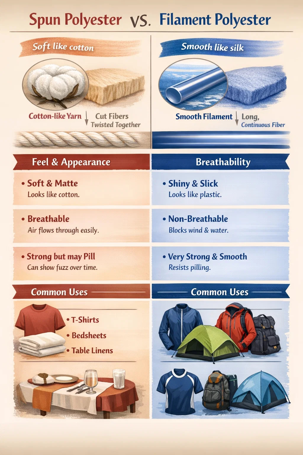 لشرح الفرق بين هذين القماشين، يمكننا استخدام تشبيه: خيوط البوليستر تشبه "خط صيد" طويل وناعم، في حين يتم تصنيع البوليستر المغزول عن طريق قطع "خطوط الصيد" هذه، وفكها، ثم لفها معًا مرة أخرى لتكوين خيط مثل "حبل القطن".